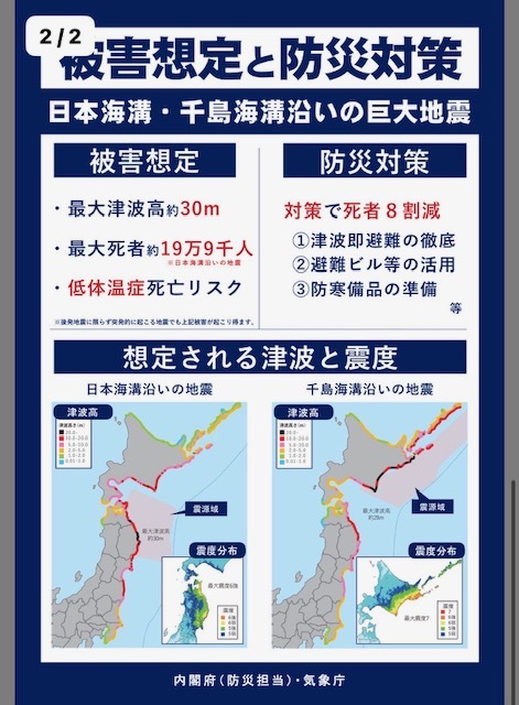 この地震の発生により、北海道の根室沖から東北地方の三陸沖にかけての巨大地震の想定震源域では、Mw8クラス以上の新たな大規模地震が発生する可能性が平常時と比べて相対的に高まっていると考えられます。